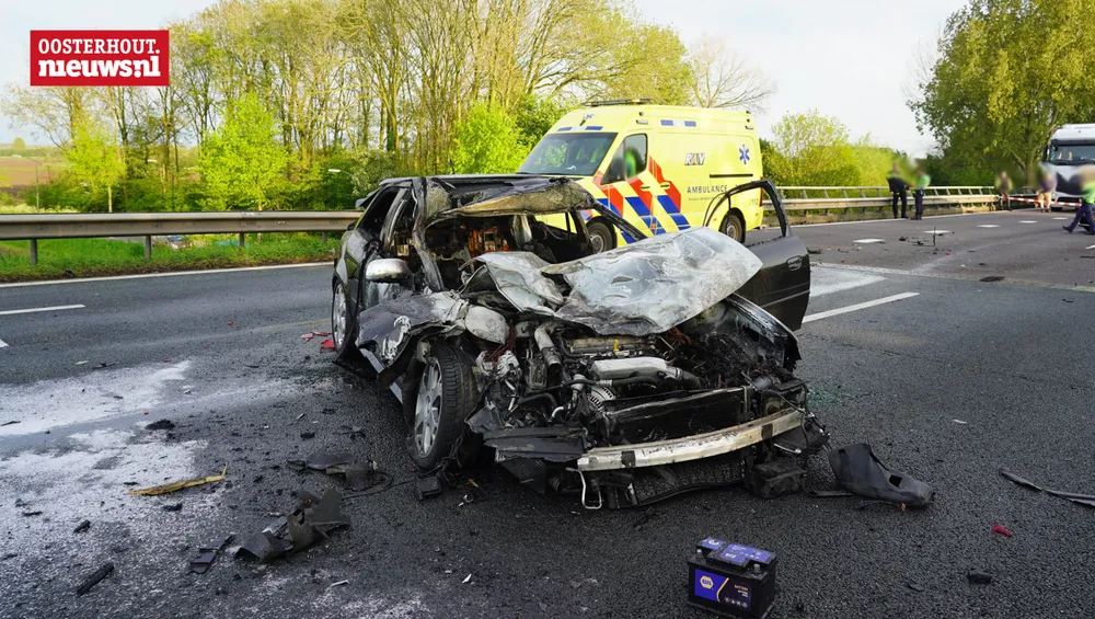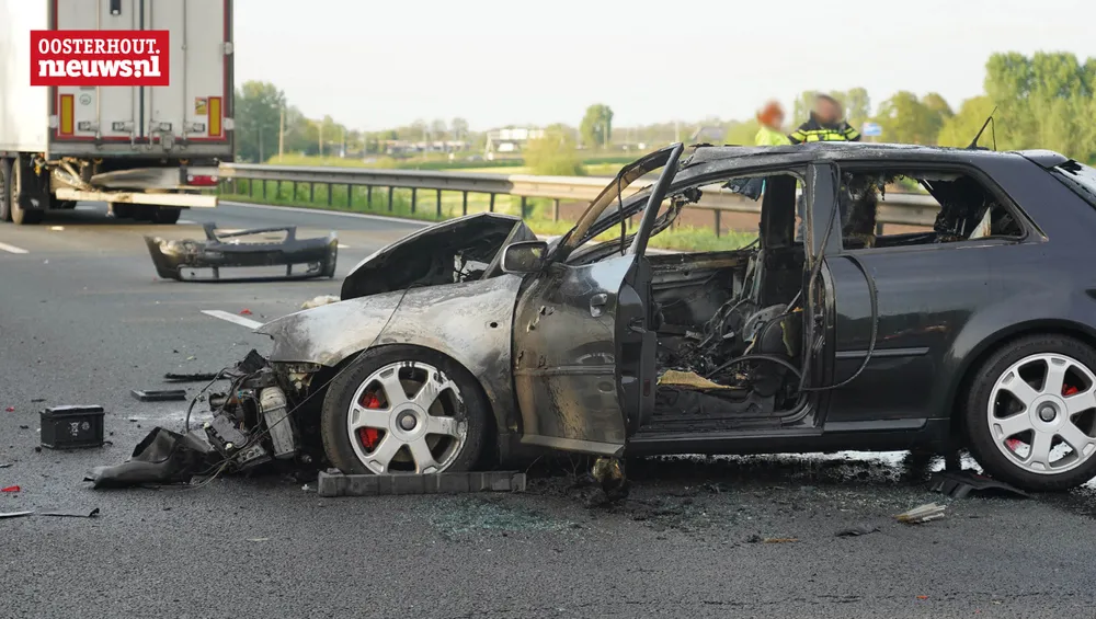 Vrijdagavond staan agenten rond 18.50 uur in de file tussen Oosterhout en Raamsdonksveer in de file wanneer er een personenwagen met grote snelheid over de vluchtstrook rijdt. Ze besluiten er achteraan te gaan en in de verte zien de de auto met volle snelheid tegen een vrachtwagen botsen. Direct na de botsing vliegt de auto in brand.