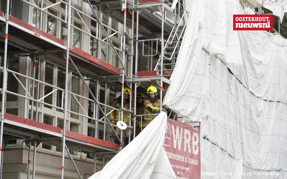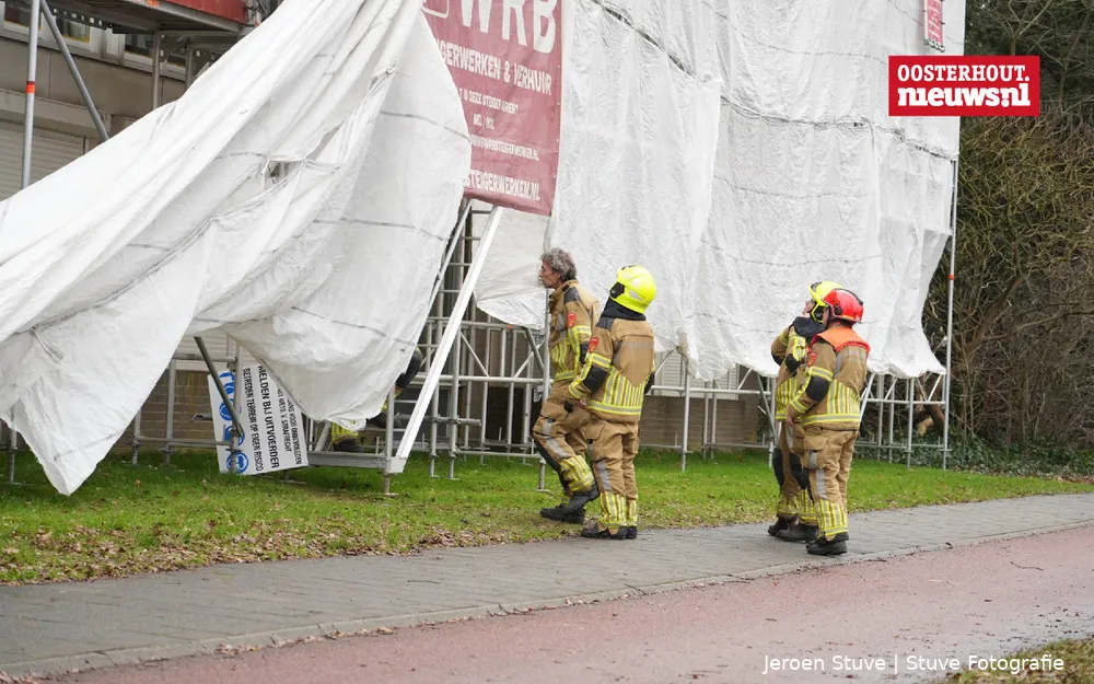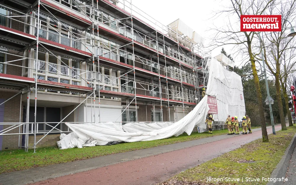 Aan de Bredaseweg in Oosterhout is de brandweer zaterrdag uitgerukt nadat een doek rondom een steiger was losgeraakt. Tegen de gevel van een appartementencomplex stond een steiger opgebouwd voor werkzaamheden. Door nog onbekende oorzaak liet het beschermdoek rondom de constructie los, waarna het gevaar bestond dat het over de straat zou waaien.