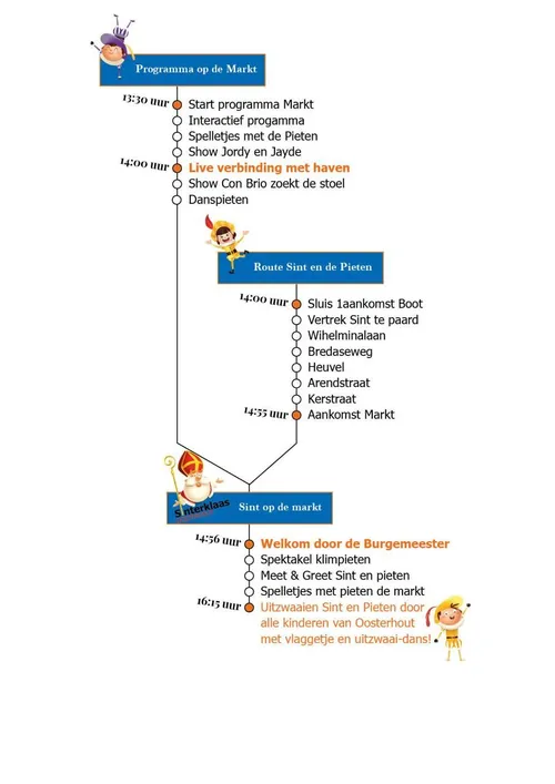 Bij Sluis 1 begint het programma ook om 14.00 uur, waar Sinterklaas op zijn trouwe paard Ozosnel aankomt. Vanuit de haven vertrekt de stoet richting de Markt, waar de Sint rond 14.55 uur wordt verwacht. Na een warm welkom door de burgemeester gaat het feest verder met Klimpieten, leuke spelletjes en een meet & greet met Sinterklaas zelf! Rond 16.15 uur zwaaien we de Sint en zijn Pieten uit, zodat ze zich kunnen voorbereiden op de vele schoenen die 's avonds gevuld moeten worden. Hieronder staat het programma schematisch weergegeven.