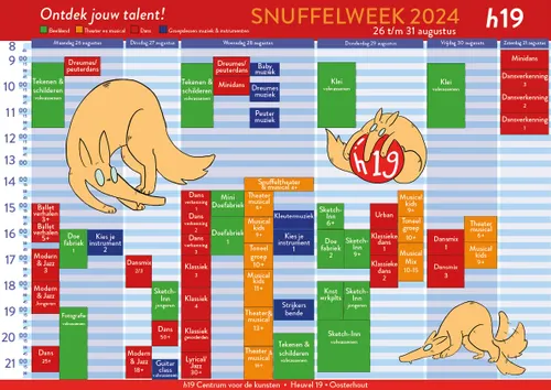 Tot en met zaterdag 31 augustus ben je welkom bij de speciale lessen van H19. Je hebt de keuze uit dans, beeldende kunst, theater/musical en de groepslessen muziek. Voor de individuele instrumentale lessen hebben ze dit jaar een aparte dag georganiseerd.