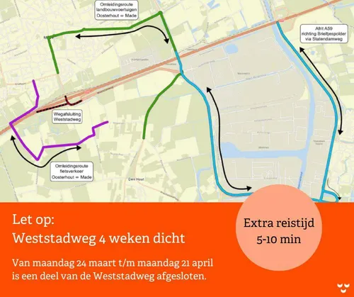 Van 24 maart tot en met 21 april wordt een deel van de Weststadweg vernieuwd. Het gaat om het stuk tussen viaduct A59 en de Haasdijk.