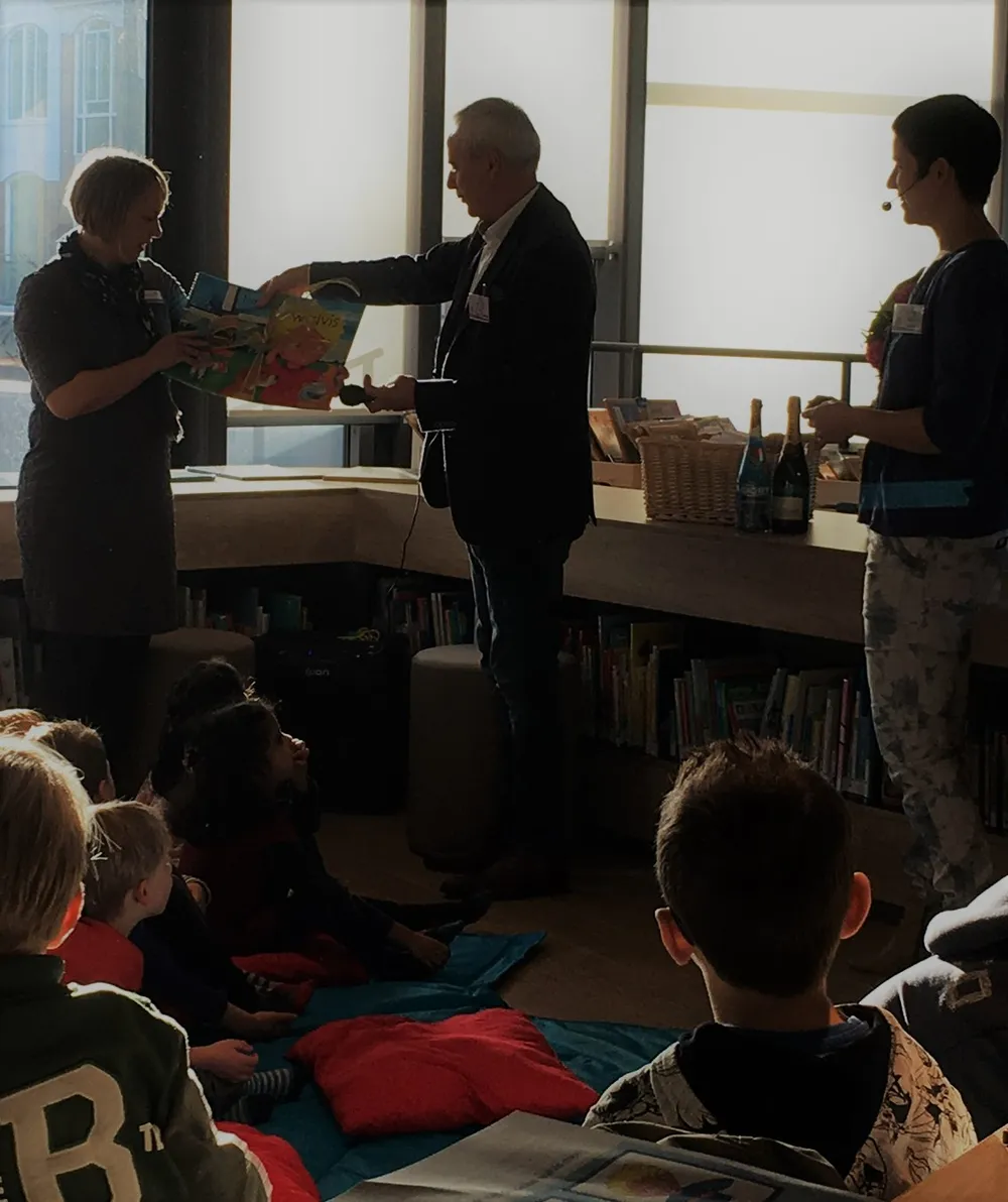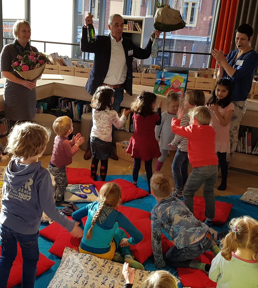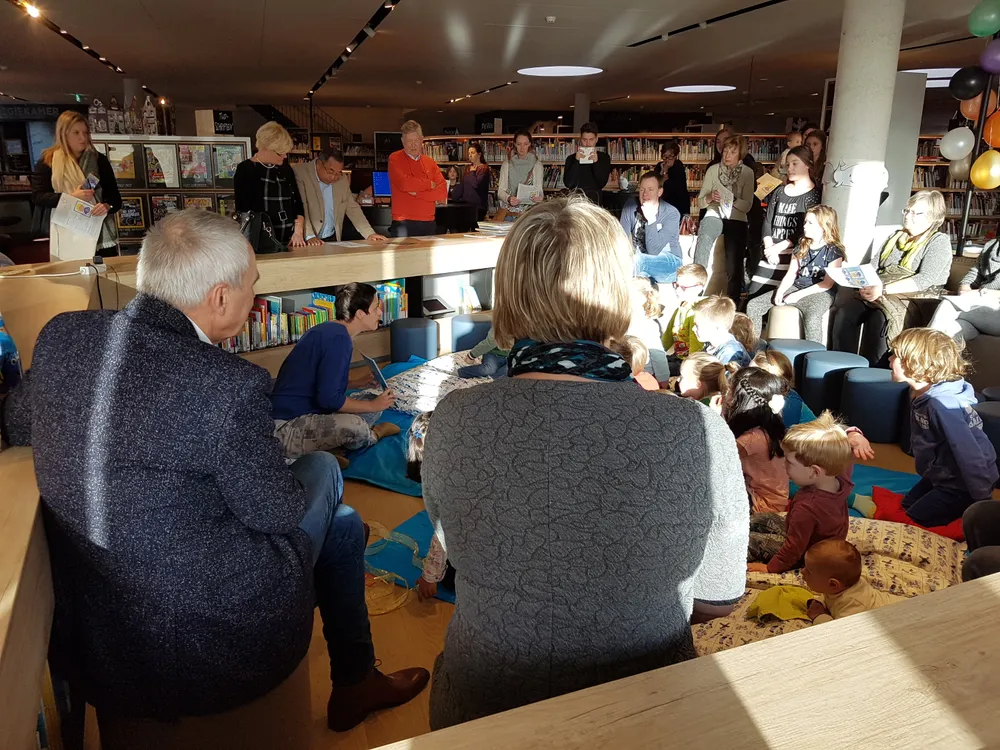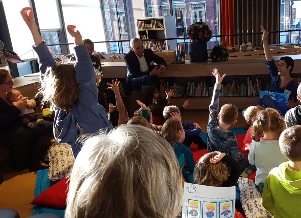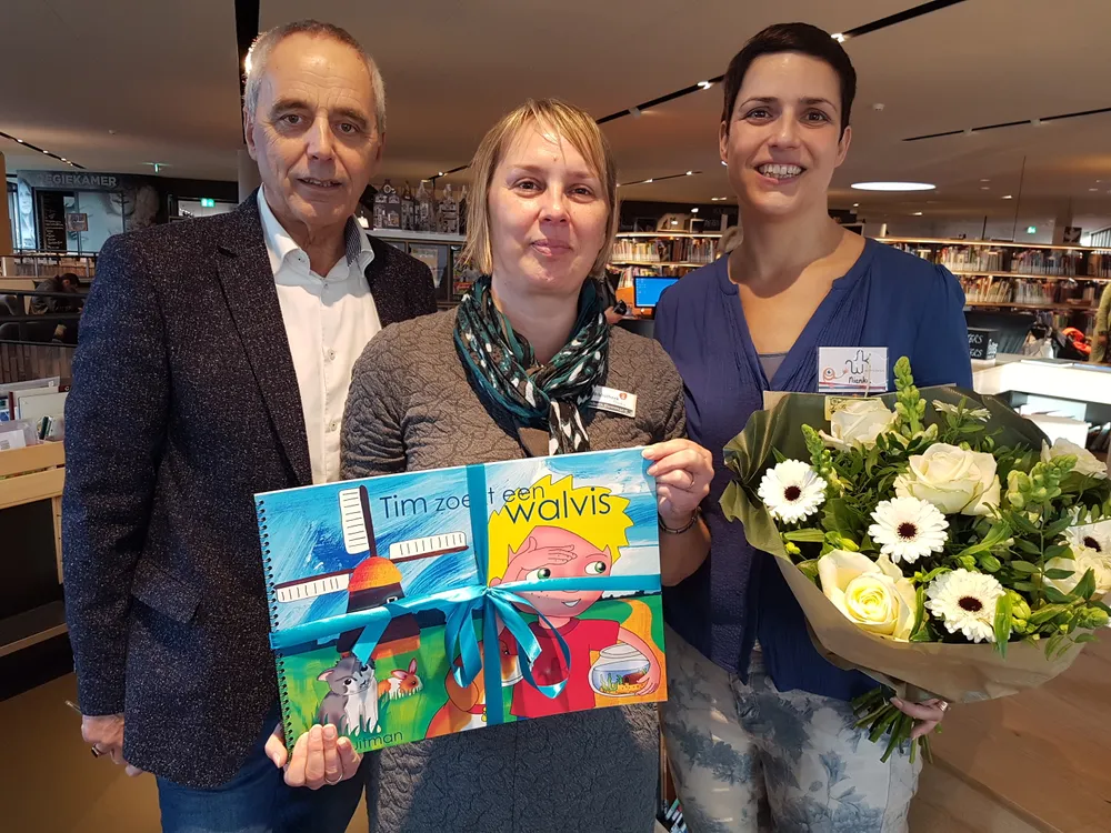 De Oosterhoutse schrijver Fons Fluitman overhandigde het eerste exemplaar van zijn prentenboek 'Tim zoekt een walvis' aan Liesbeth Blommaert, Specialist Educatie Jeugd. De aanwezige kinderen deden de gebaren uit het boek enthousiast na. Bijzonder aan dit boek is dat naast de kleurrijke kijkplaten de kerngebaren afzonderlijk getekend zijn door Elsbeth van der Poel.