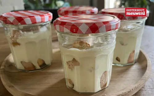 Maak nu laagjes van de kwark, lange vingers, kwark, etc. Deze tiramisu maak je in de ochtend en zet je afgedekt met plasticfolie in de koelkast. Tik de potjes even aan op een dikke handdoek zodat de tiramisu wat naar de bodem zakt. Net voor het serveren aftoppen met grof geschaafde krullen van witte chocolade (die in de koelkast heeft gelegen) en een beetje limoenrasp erover voor de kleur. Een plaatje om te zien en heerlijk van smaak. In plaats van citroen kun je ook sinaasappelsap en -rasp gebruiken en dan met melkchocoladekrullen afwerken. Het werkt ook goed met passievrucht en sinaasappelsap.