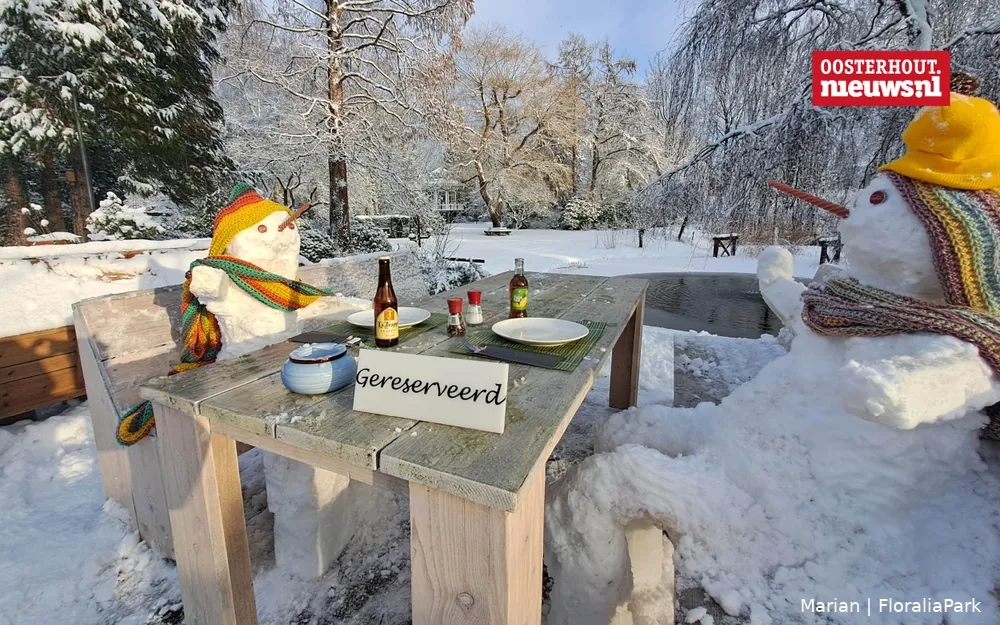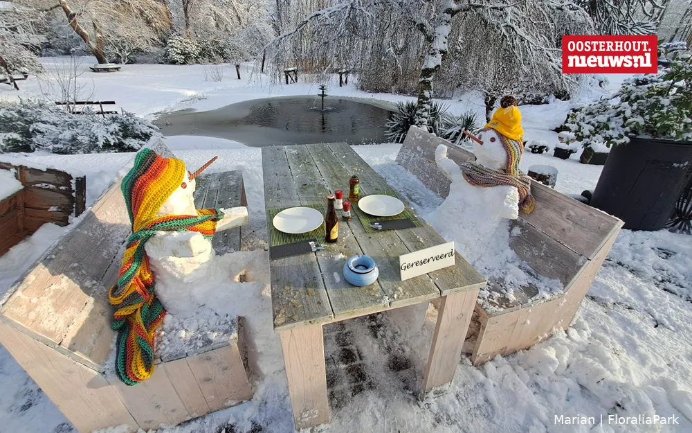 Wie maandag een wandeling maakte door het Floraliapark in Oosterhout, keek waarschijnlijk even twee keer. Op het terras zaten namelijk geen gewone bezoekers, maar twee sneeuwpoppen gezellig aan een tafel. Een winters tafereel dat perfect paste bij de sneeuwval van de afgelopen dagen.